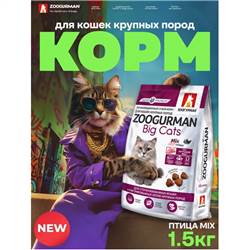 Сухой корм д/кошек крупных пород Zoogurman Big Cats, Птица/Mix 1,5 кг